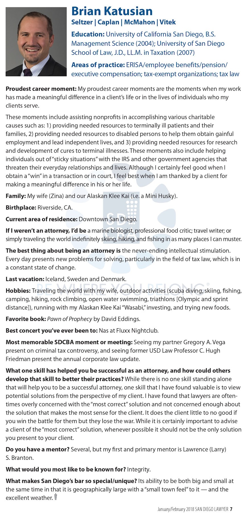 SCMV Shareholder Brian Katusian was featured in the January/February issue of San Diego Lawyer Magazine, published by the San Diego County Bar Association. In the publication’s Why I Belong column, Brian shares many facets of his legal career and personality.